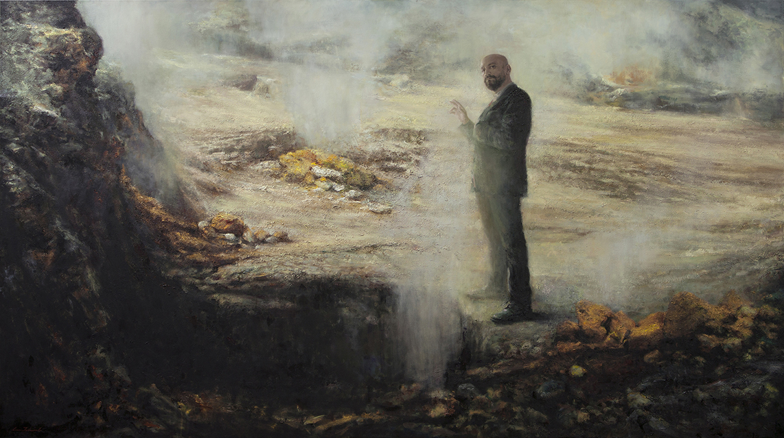 For me, this initial view looks mysterious and dark, Italian Mafia meet Turner. It also reminds me when I first met my husband and he said something along the lines of, follow and see how deep the rabbit hole goes. Perhaps this is what he is saying here, though there is more of a sense of foreboding in the painting which wasn’t true in our life. The contrast between the dark depths of the pit below his feet and the white misty landscape behind is stunning. The likeness to my husband is remarkable it looks like a photograph of him. I want to take a closer look so I really hope I can see it in the flesh on day.