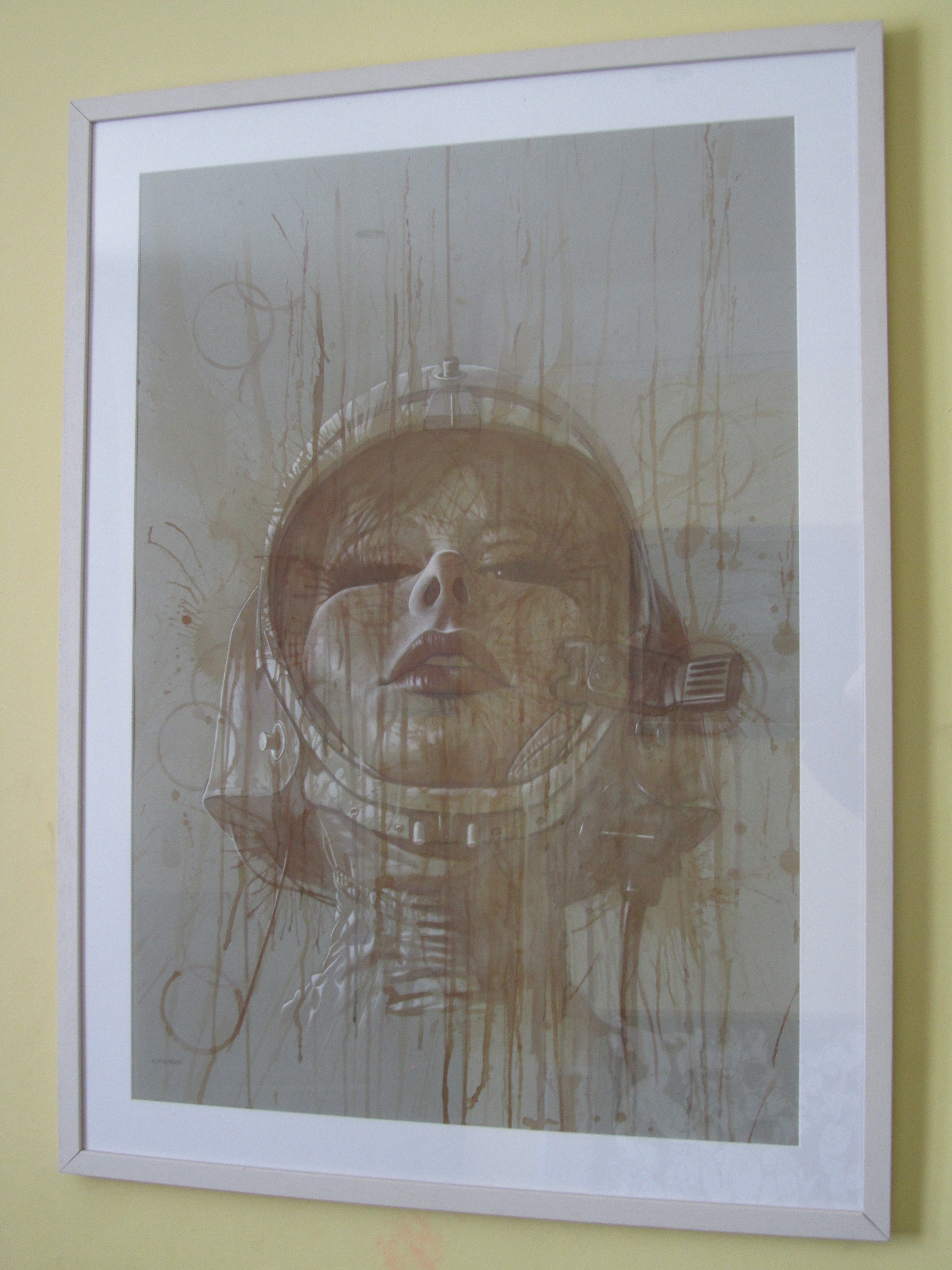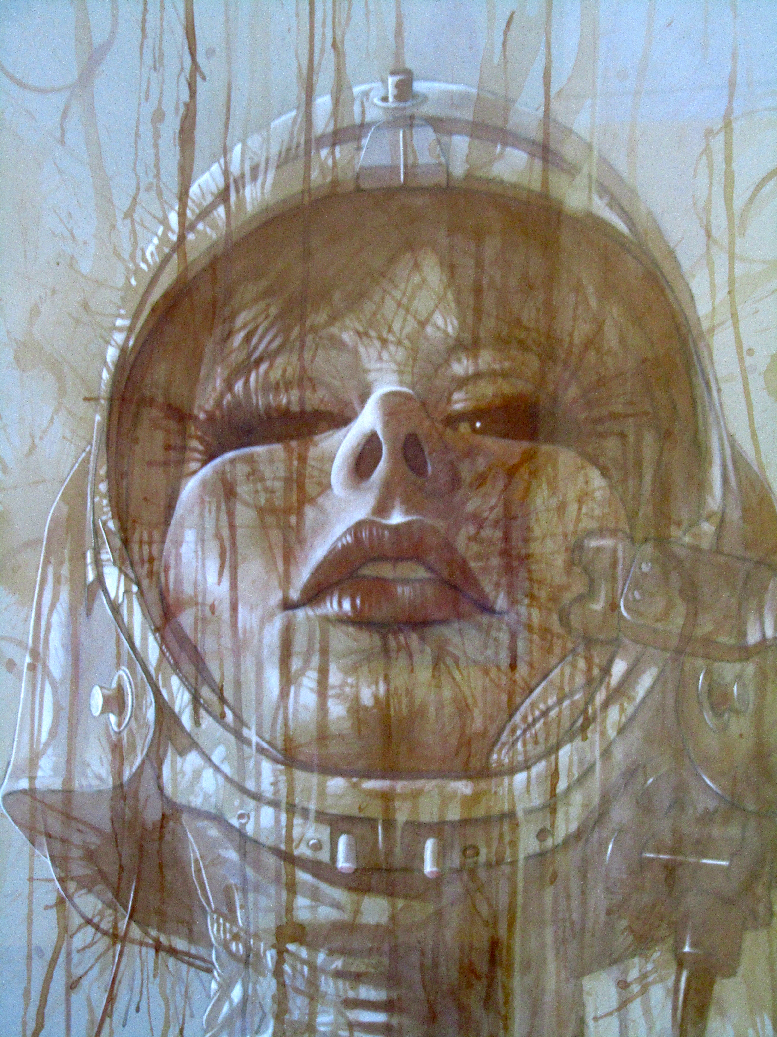 …not even knowing the title I thought of David Bowie singing ‘Ground control to Major Tom’. Obviously the space helmet, the astro-girl, outer space feel to the paining all some cues. I love the use of tea, drips and splashes and even evidence of a tea-cup in the left corner here. The detail is also amazing and in this the unusual angle. The boys find it a bit eery, it is unusual but I love it. In my search about the artist I found a fellow word press article and the words that the work is “Fusing elements of the classical, the expressive, the surreal, beauty, darkness and his love of the human form”. This is an interesting link to my husband’s work which is focused on the human form. Like the previous swaps, it seemed such a good connection, perhaps it’s the symbol on this little keyhole man that makes me think of space aliens or darth vader. So for this art swap we sent ‘Poison’ in exchange for ‘In Search of Major Tom’.